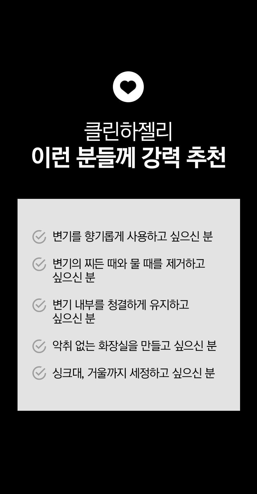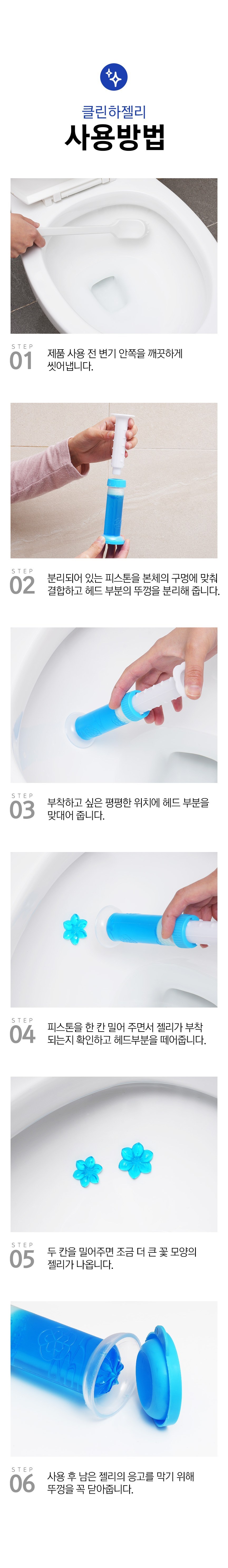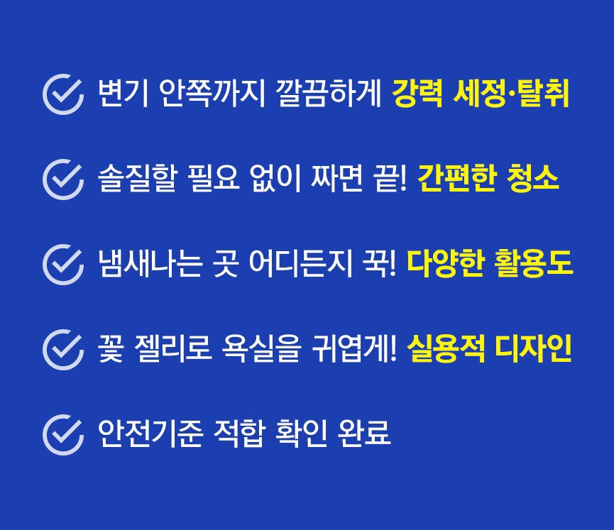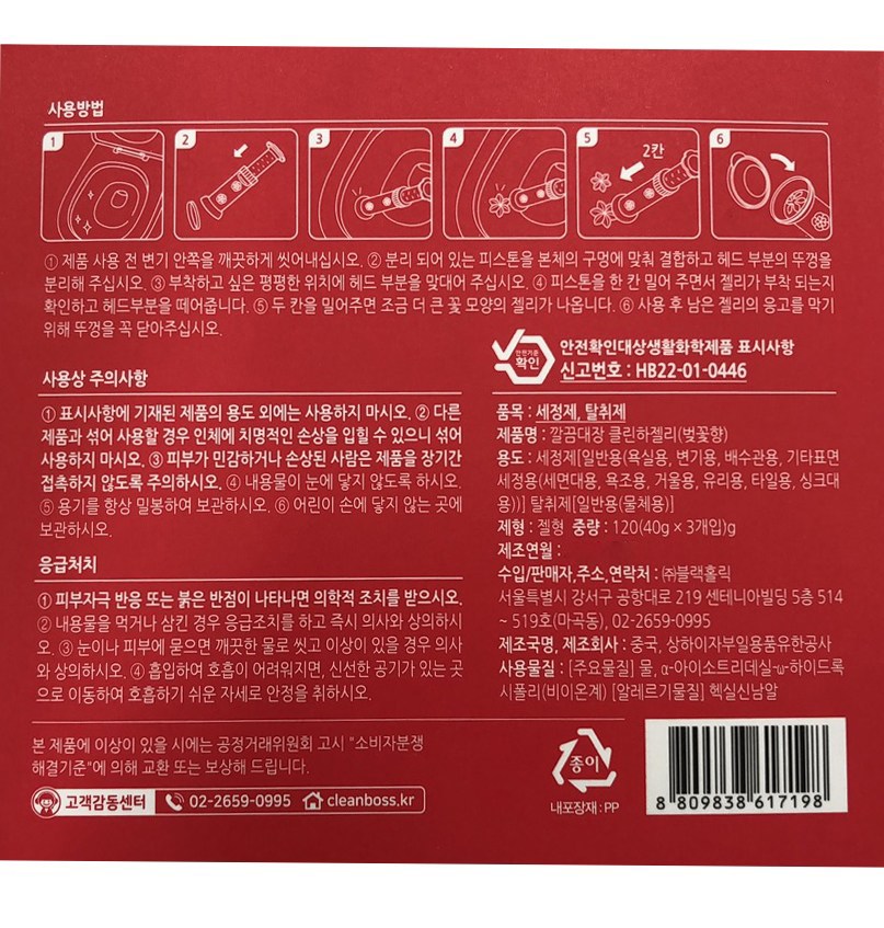 | 품목 및 제품명 | 세정제, 탈취제 / 깔끔대장 클린하젤리(벚꽃향) | 용도(표백제의 경우 계열을 함께표시) 및 제형 | 세정제 [일반용(욕실용, 변기용, 배수관용, 기타표면 세정용(세면대용, 욕조용, 거울용, 유리용, 타일용, 싱크대용))] 탈취제 [일반용(물체용)] / 젤형 |