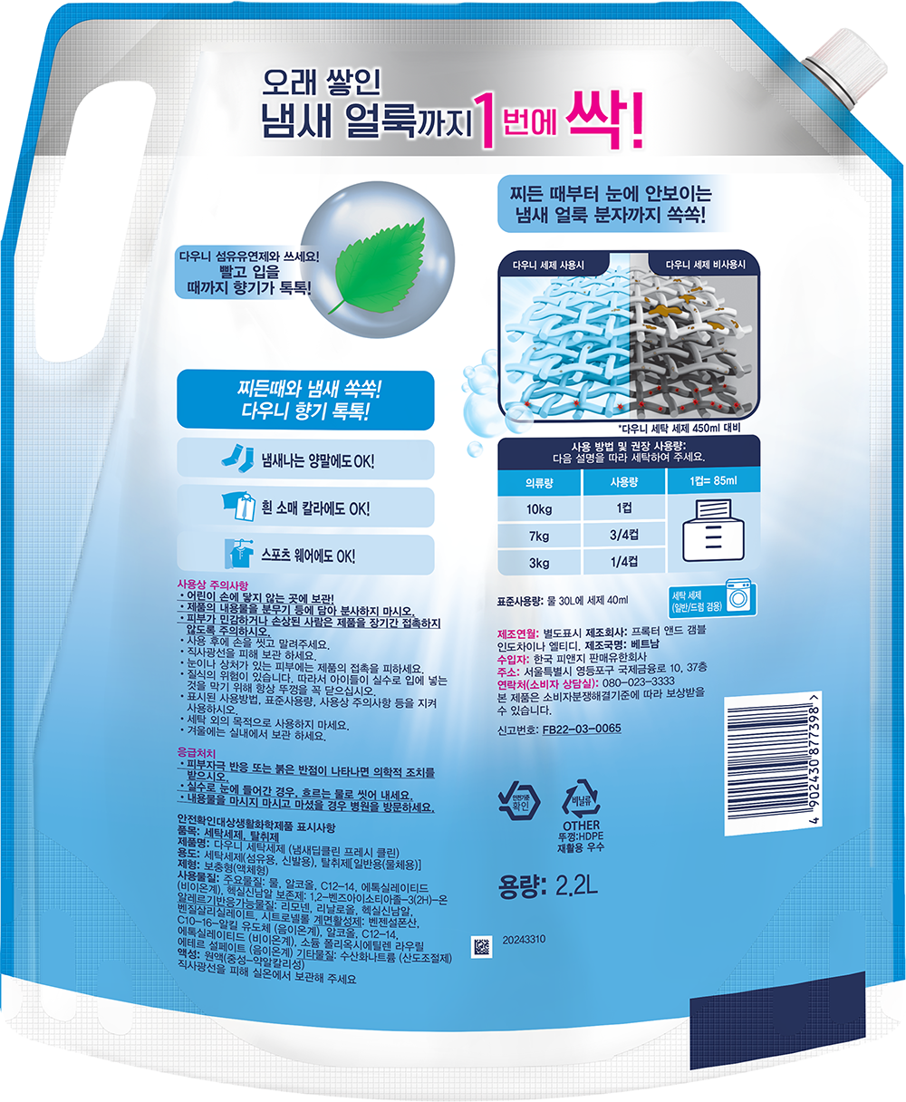 | 품목 및 제품명 | 탈취제,세탁세제 / 다우니 세탁세제 (냄새딥클린 프레시 클린) | 용도(표백제의 경우 계열을 함께표시) 및 제형 | 탈취제[일반용(물체용)],세탁세제(신발용,섬유용)/액체형 |