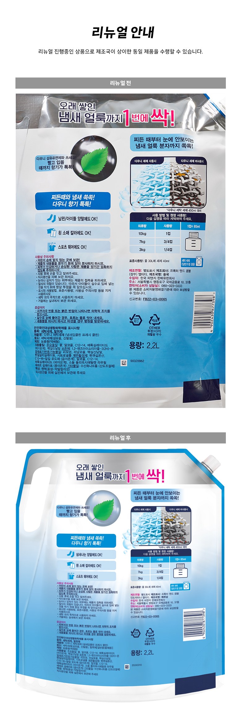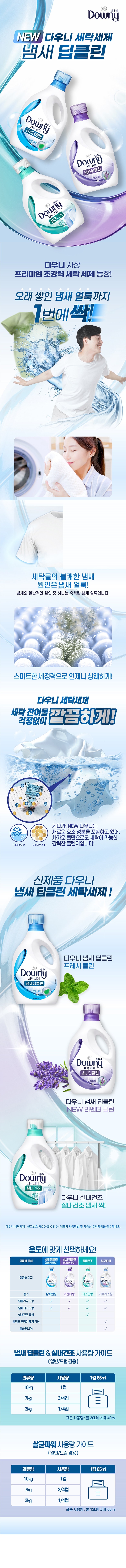 | 품목 및 제품명 | 탈취제,세탁세제 / 다우니 세탁세제 (냄새딥클린 프레시 클린) | 용도(표백제의 경우 계열을 함께표시) 및 제형 | 탈취제[일반용(물체용)],세탁세제(신발용,섬유용)/액체형 |