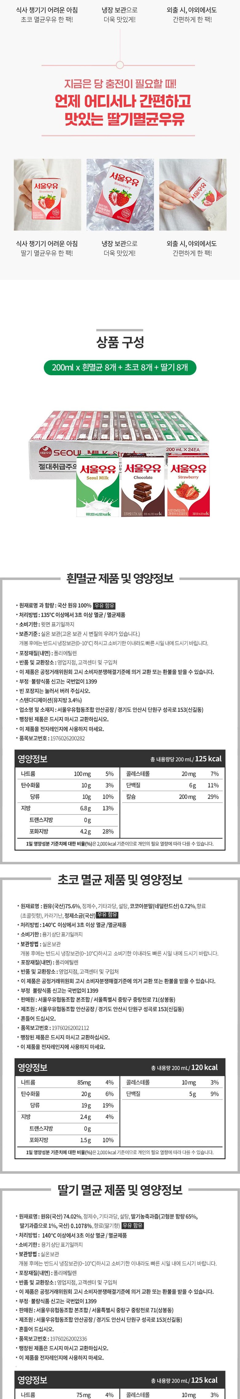 | 포장단위별 내용물의 용량(중량), 수량 | 멸균우유 200ml 8개, 초코우유 200ml 8개, 딸기우유 200ml 8개 | 원재료명 및 함량 | 상품 상세페이지 참조 |