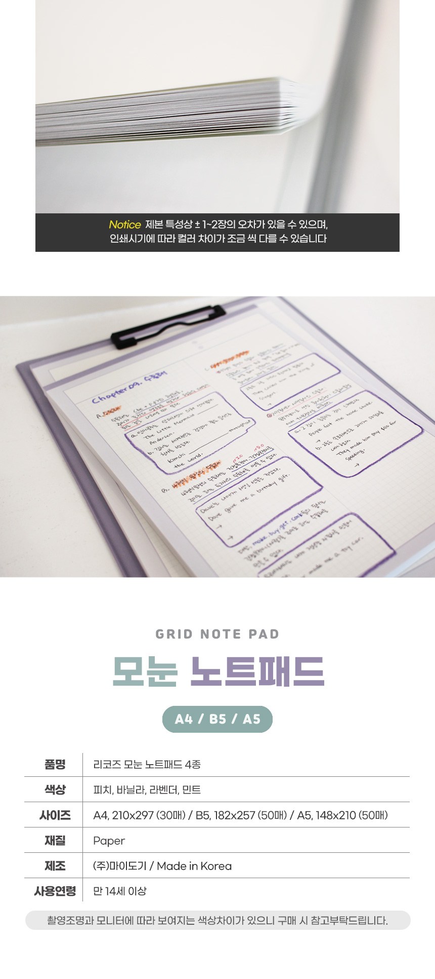 | 품명 및 모델명 | 리코즈 모눈 노트패드 A5 50매 4종 세트 | 인증/허가 사항 | 해당없음(14세이상) |