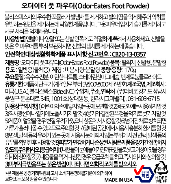 | 품목 및 제품명 | 탈취제/오더이터 풋 파우더 | 용도(표백제의 경우 계열을 함께표시) 및 제형 | 일반용(물체용),신발용/비분사형-분말형 |