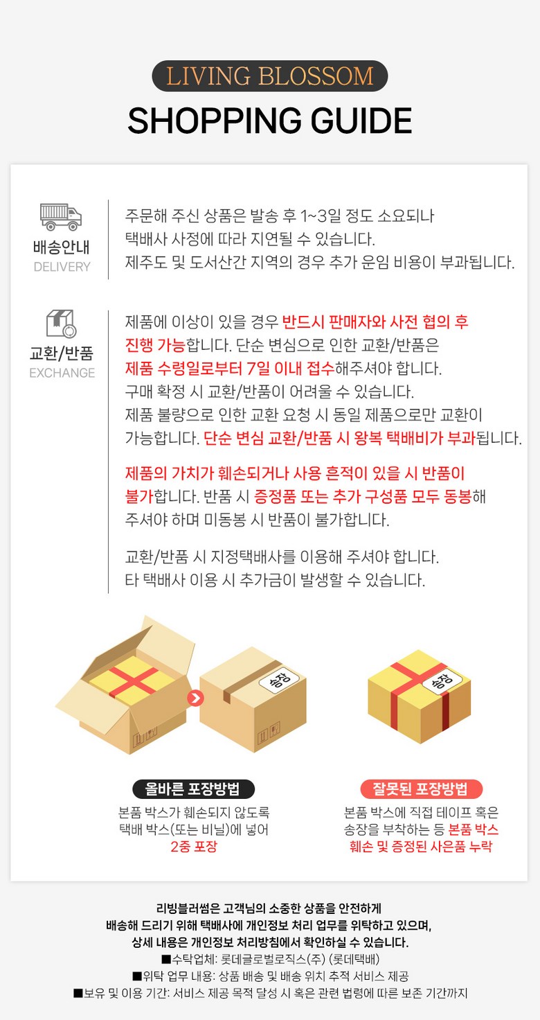 - ㆍ모니터 해상도의 차이로 인해 색상이나 이미지가 실제와 달라, 고객이 단순 변심으로 교환/반품을 무료로 요청하는 경우