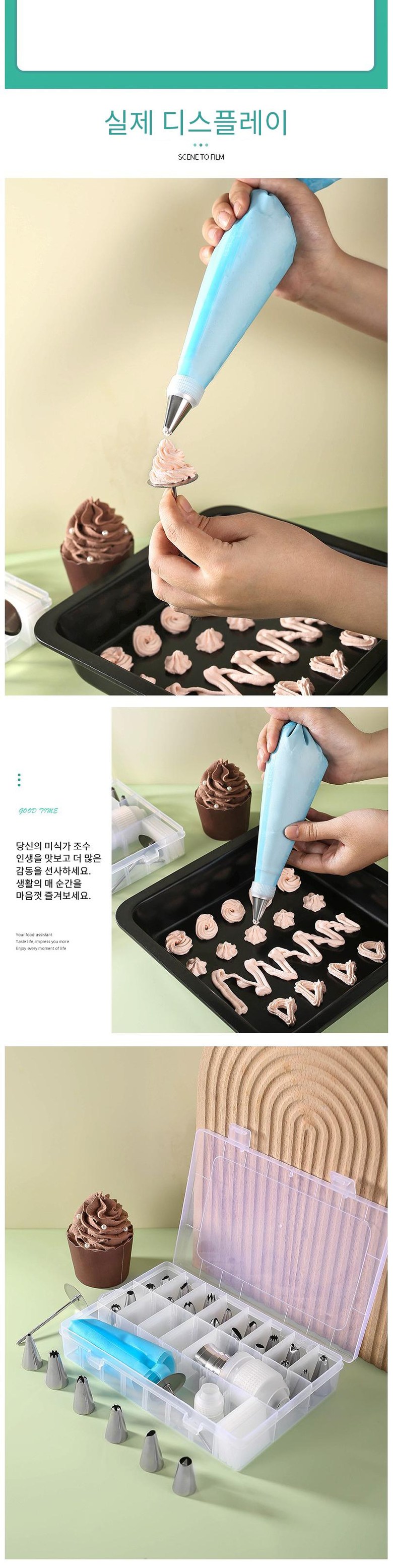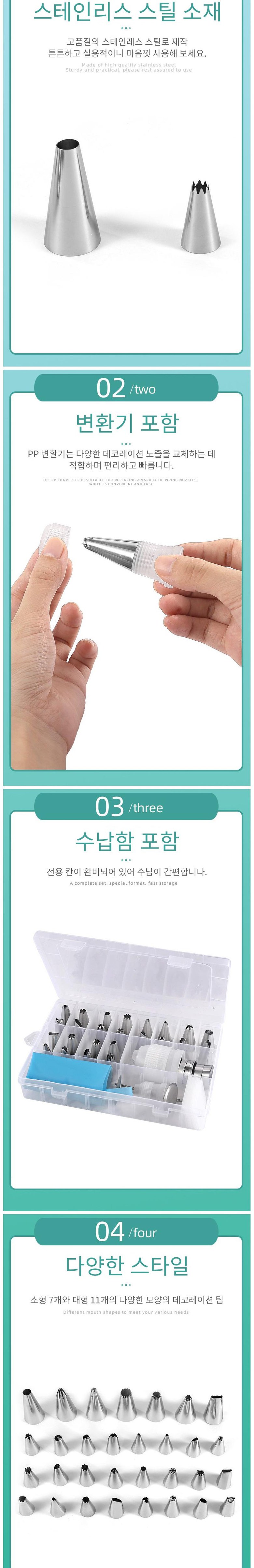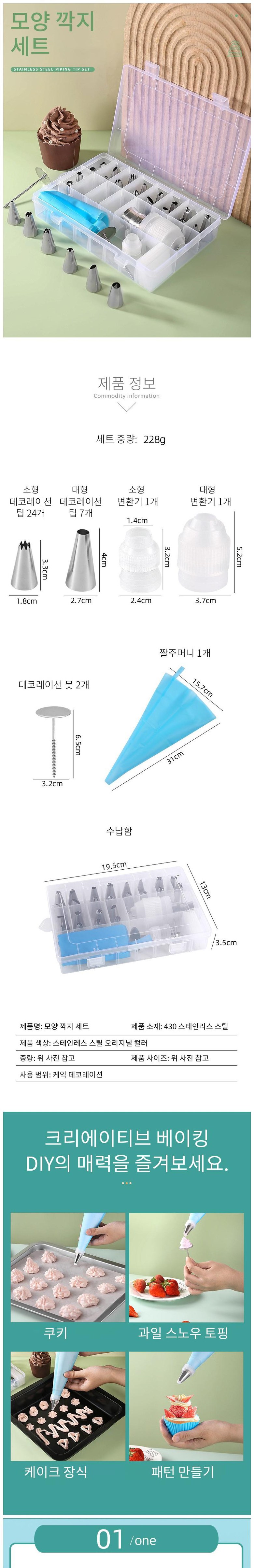 소형 데코레이션 팁 24개 + 대형 데코레이션 팁 7개 + 소형 변환기 1개 + 대형 변환기 1개 + 데코레이션 못 2개 + 짤주머니 1개 + 투명 상자 1개 포함