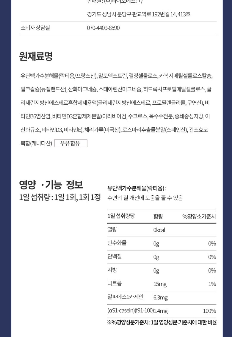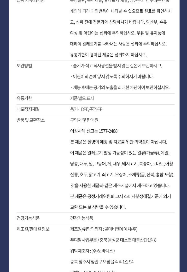 | 원료명 및 함량 | 상품 상세페이지 참조 | 영양정보 | 상품 상세페이지 참조 |
