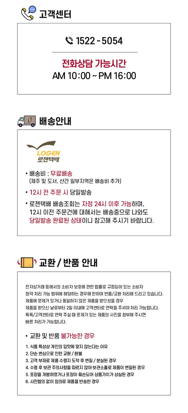 - ㆍ교환/반품에 관한 일반적인 사항은 판매자가 제시사항보다 관계법령이 우선합니다.