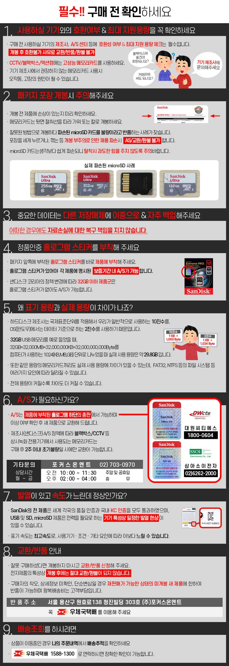 | 소비자상담 관련 전화번호 | 쿠팡고객센터 1577-7011, 판매자:(주)포커스온엔트:02-703-0790, A/S관련:샌디스크 기술지원팀 (00798-1420-38756), 대원CTS:1800-0604, 삼아소이전자:02-6262-2000 | ||