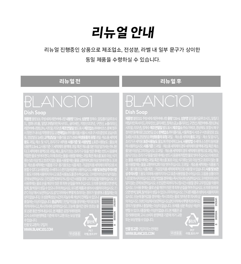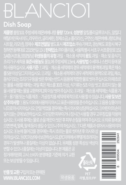 | 품명 및 모델명 | 블랑101 주방세제 레몬버베나향 | 인증/허가 사항 | 위생용품 |