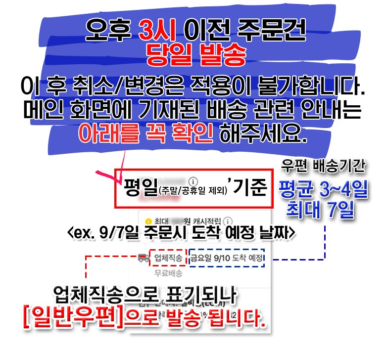 | 배송기간 | ㆍ도서산간 지역 등은 배송에 3-5일이 더 소요될 수 있습니다. - 천재지변, 물량 수급 변동 등 예외적인 사유 발생 시, 다소 지연될 수 있는 점 양해 부탁드립니다. | ||