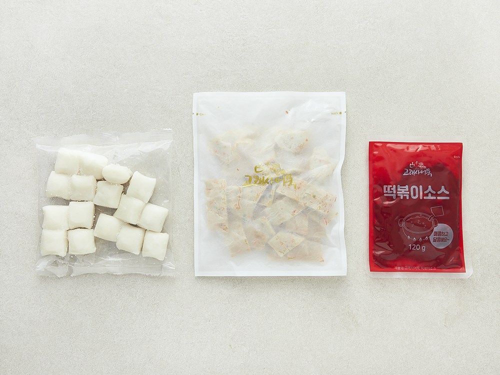 떡, 어묵, 떡볶이소스로 구성되어 있습니다.