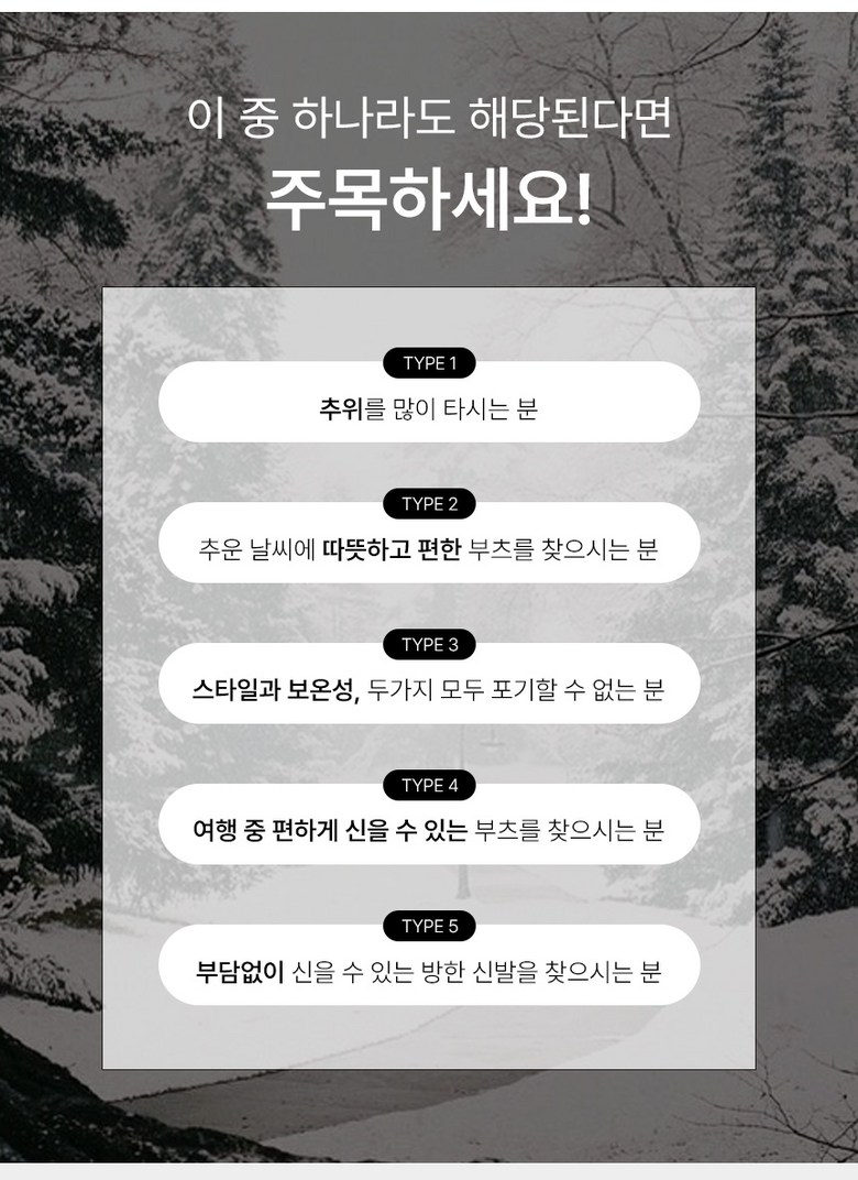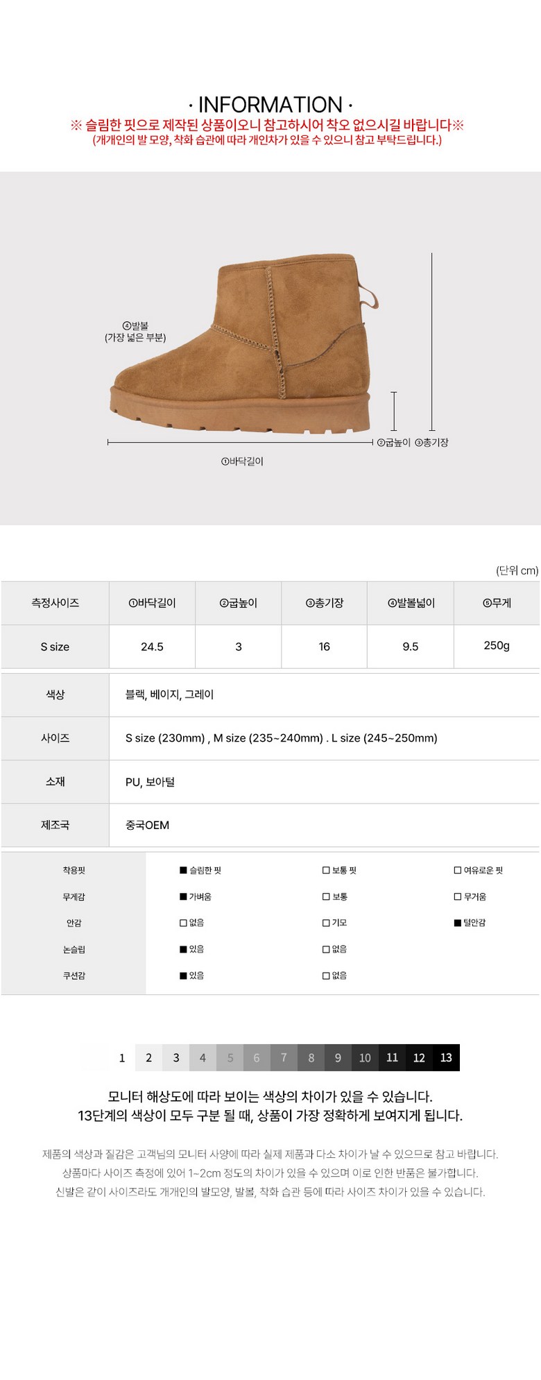 | 제품의 주소재(운동화인 경우에는 겉감,안감을 구분하여 표시) | PU, 보아털 | 색상 | 블랙, 베이지, 그레이 |