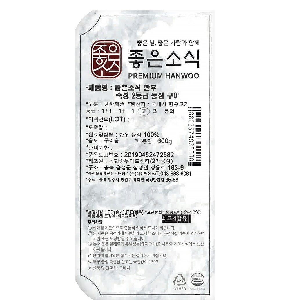 | 제조연월일, 소비기한 또는 품질유지기한 | 업데이트 예정 | 세부 품목군별 표시사항 | 축산물 등급표시 : 2등급 / 이력번호 표시유무 : 이력번호 표시제품임 |