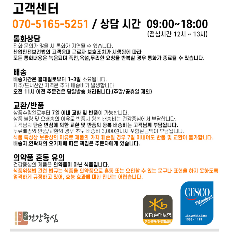 | 교환/반품 신청 기준일 | ㆍ단순변심에 의한 교환/반품은 제품 수령 후 7일 이내까지, 교환/반품 제한사항에 해당하지 않는 경우에만 가능 (배송비용과 교환/반품 비용 왕복배송비 고객부담) ㆍ상품의 내용이 표시·광고의 내용과 다른 경우에는 상품을 수령한 날부터 3개월 이내, 그 사실을 안 날 또는 알 수 있었던 날부터 |