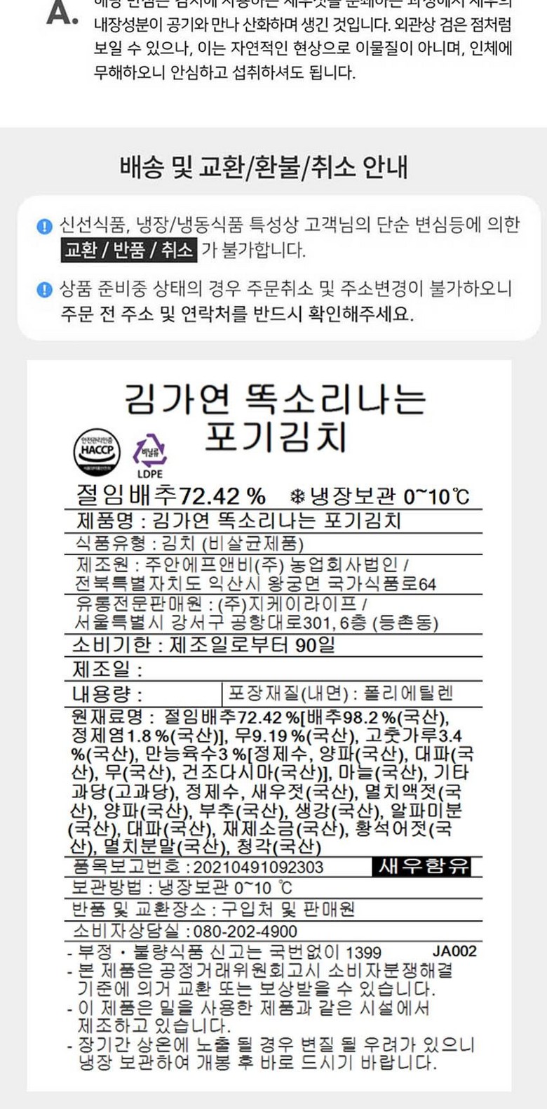 | 포장단위별 내용물의 용량(중량), 수량 | 포기김치10kg | 원재료명 및 함량 | "절임배추72.42%[배추98.2%(국산),정제염1.8%(국산)],무9.19%(국산),고춧가루3.4%(국산),만능육수3%[정제수,양파(국산),무(국산),대파(국산),건조다시마(국산)],마늘(국산),기타과당(고과당),정제수,새우젓(국산),멸치액젓(국산),양파(국산),부추(국산),생강(국산),알파미분(국산),대파(국산),재제소금(국산),황석어젓(국산),멸치분말(국산),청각(국산) [새우함유]" |