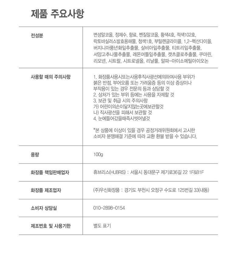 | 화장품제조업자, 화장품책임판매업자 및 맞춤형화장품판매업자 | 상품 상세페이지 참조 | 제조국 | 상품 상세페이지 참조 |