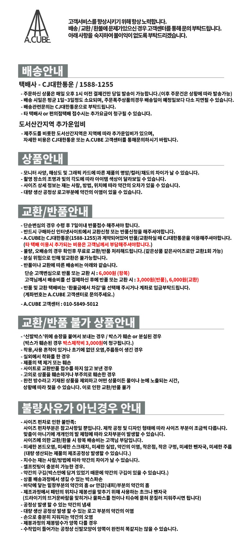 - ㆍ모니터 해상도의 차이로 인해 색상이나 이미지가 실제와 달라, 고객이 단순 변심으로 교환/반품을 무료로 요청하는 경우