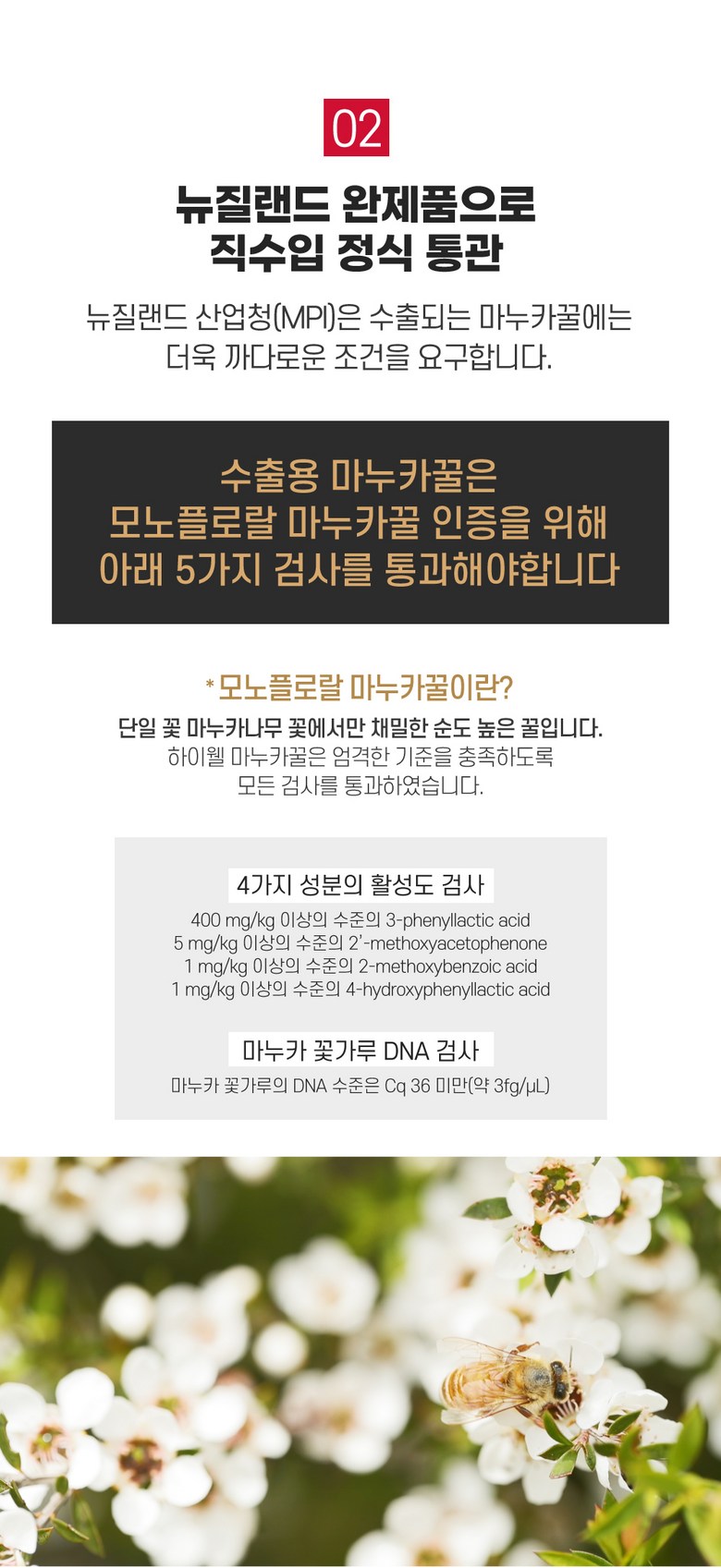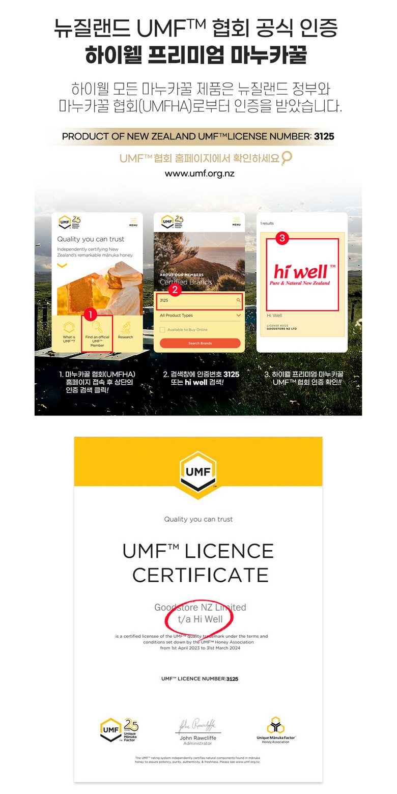 | 생산자 및 소재지 | 수출국 및 제조업소: 뉴질랜드 Apipac NZ Ltd. / 판매원: ㈜하이웰코리아 | 제조연월일, 소비기한 또는 품질유지기한 | 소비기한(또는 유통기한) : 2030년 03월 24일 이거나 그 이후인 상품 제조년월일 : 2025년 03월 26일 이후인 제조상품 |