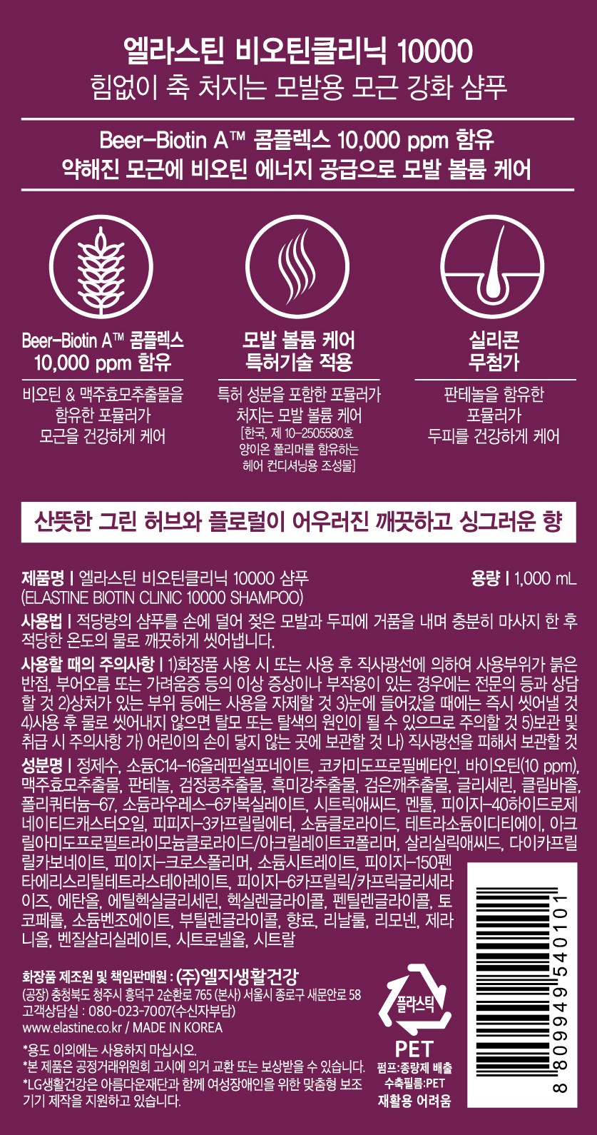 | 용량(중량) | 1000ml | 제품 주요 사양 | 모든 모발용 |
