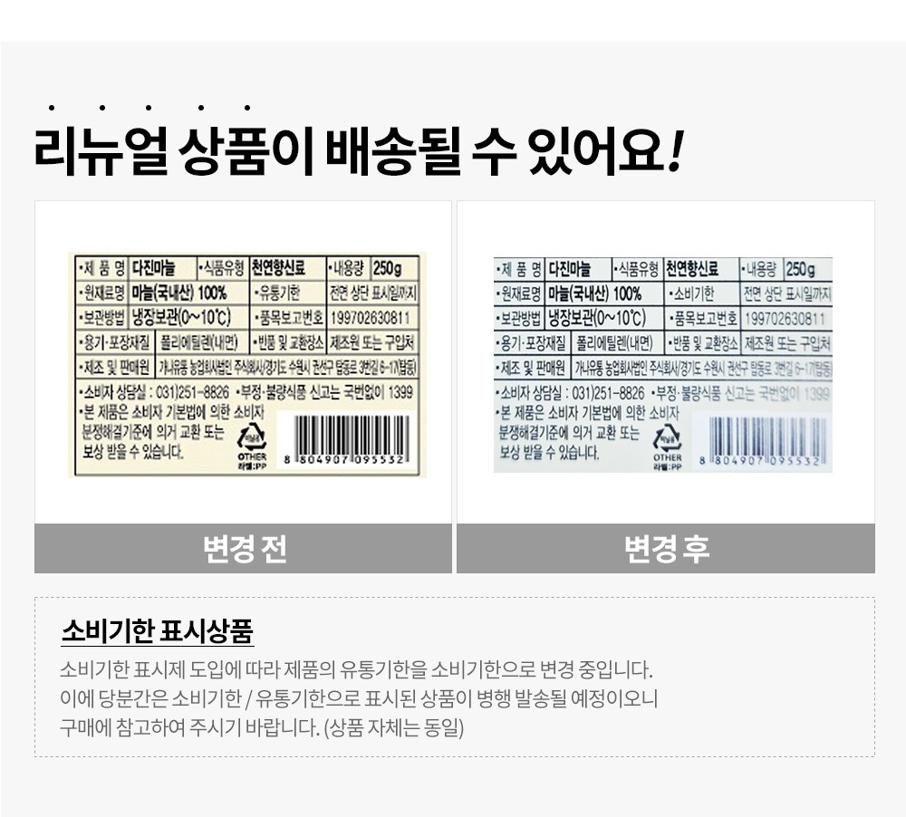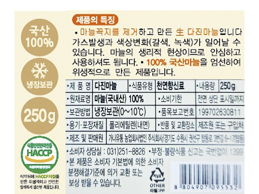 | 첨가물을 사용하지 않은 마늘 100% 상품으로, 생마늘의 자연스러운 갈변 현상으로 인해 녹색 혹은 갈색빛을 띨 수 있습니다. 이는 품질의 이상이 아니며, 소비기한이 짧으니 가급적 빠른 시일 내에 섭취해주세요. |