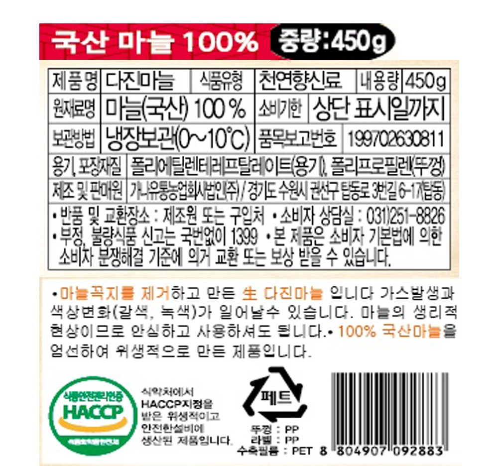 | 첨가물을 사용하지 않은 마늘 100% 상품으로, 생마늘의 자연스러운 갈변 현상으로 인해 녹색 혹은 갈색빛을 띨 수 있습니다. 이는 품질의 이상이 아니며, 소비기한이 짧으니 가급적 빠른 시일 내에 섭취해주세요. |