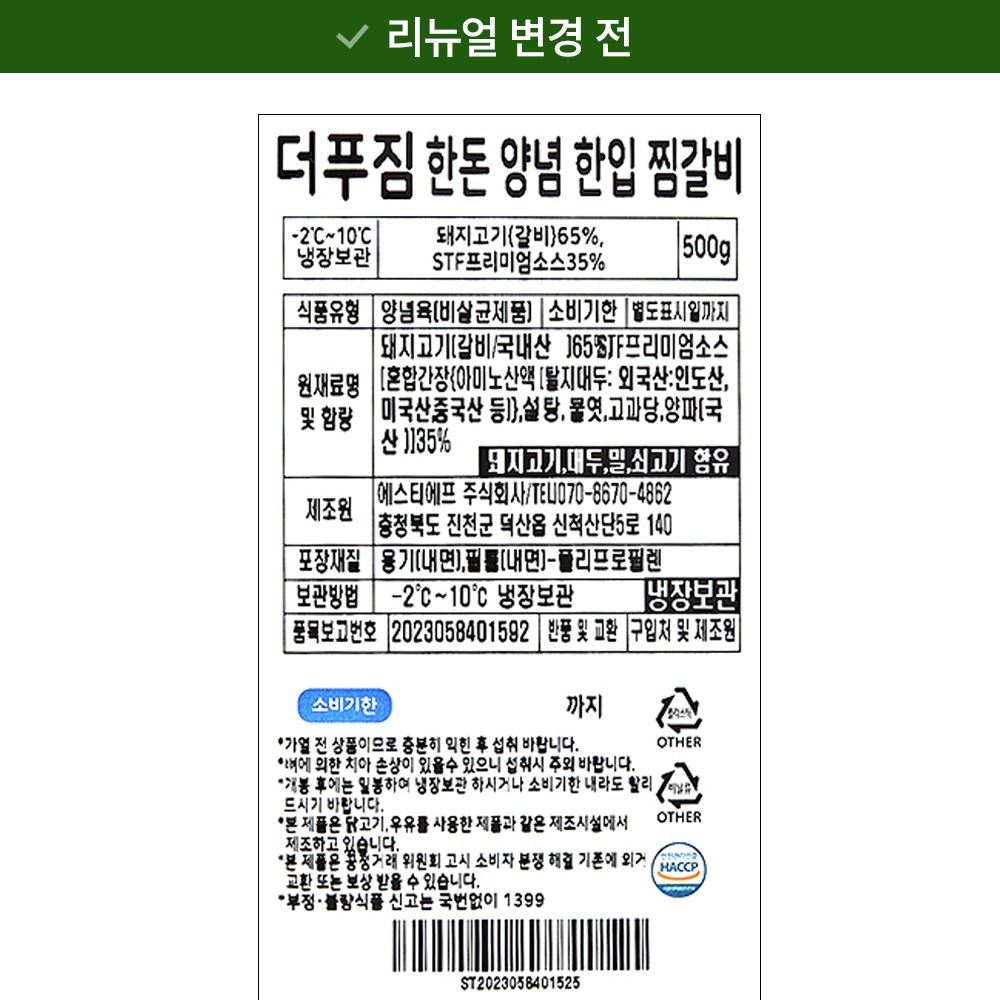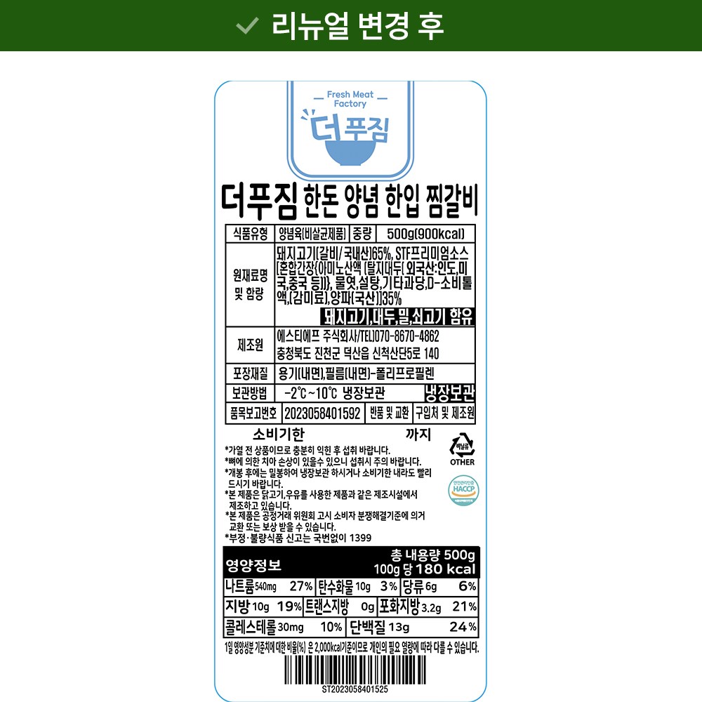 | 제품명 | 더푸짐 한돈 양념 한입 찜갈비 | 식품의 유형 | 컨텐츠 참조 |