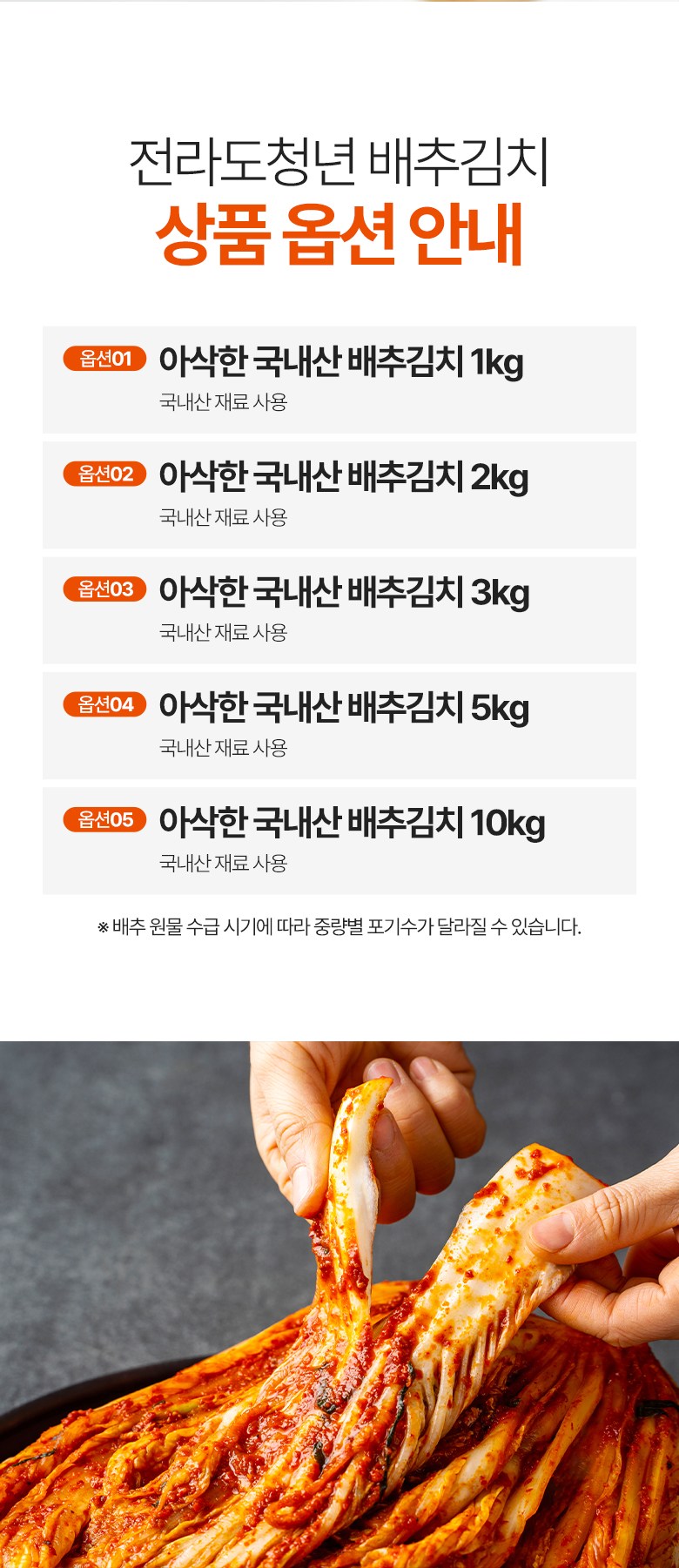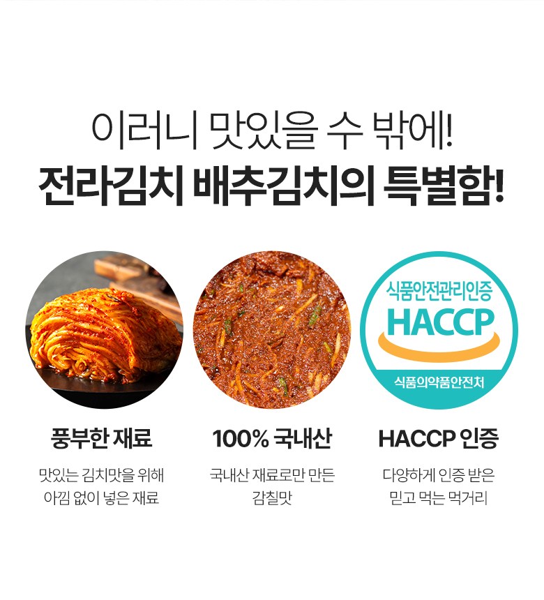 | 품목 또는 명칭 | 전라김치 포기배추김치 | 포장단위별 내용물의 용량(중량),수량,크기 | 1kg,2kg,3kg,5kg,10kg |