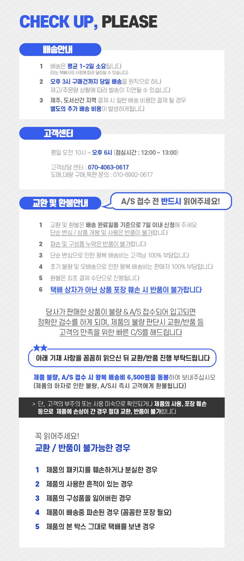 - ㆍ교환/반품에 관한 일반적인 사항은 판매자가 제시사항보다 관계법령이 우선합니다.