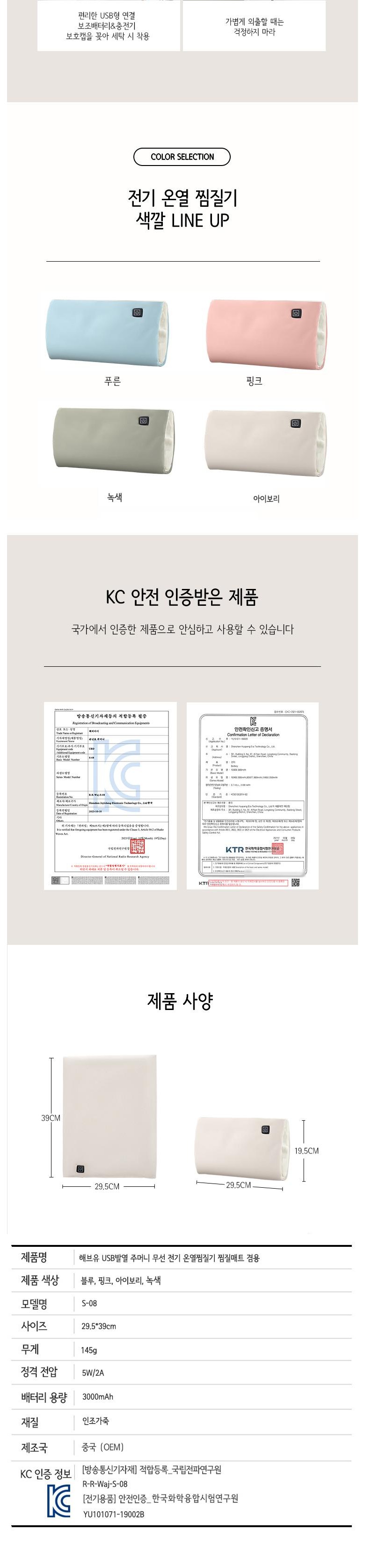 | 품명 및 모델명 | 해브유 USB발열 주머니 무선 전기 온열찜질기 찜질매트 겸용 | KC 인증정보 | [방송통신기자재] 적합등록_국립전파연구원 R-R-Waj-S-08[전기용품] 안전인증_ 한국화학융합시험연구원 YU101071-19002B |