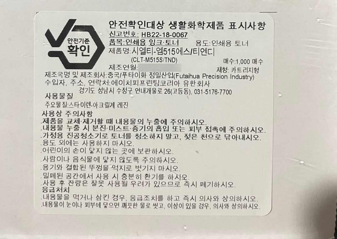 | 품목 및 제품명 | 인쇄용 잉크·토너/시엘티-엠515에스/티엔디(CLT-M515S/TND) | 용도(표백제의 경우 계열을 함께표시) 및 제형 | 인쇄용 토너/비분사형-카트리지형 |