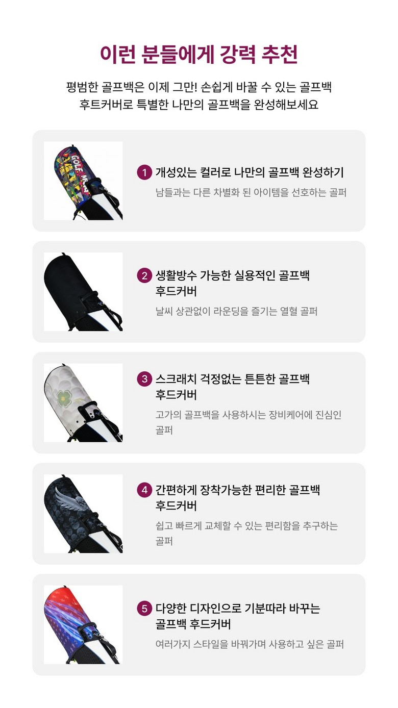 | 품명 및 모델명 | 캐디백 후드커버 / 17종 디자인 캐디백 방수 후드커버 | KC 인증정보 | 상품 상세페이지 참조 |