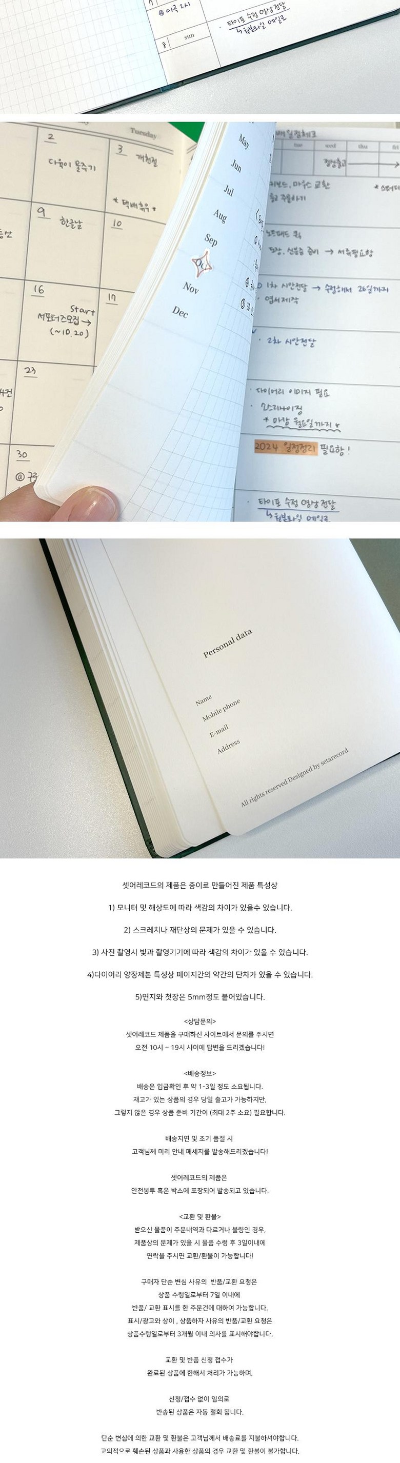 | 품명 및 모델명 | 셋어레코드 2024 만년 다이어리 위클리 데일리 플래너 | 인증/허가 사항 | 해당없음 |