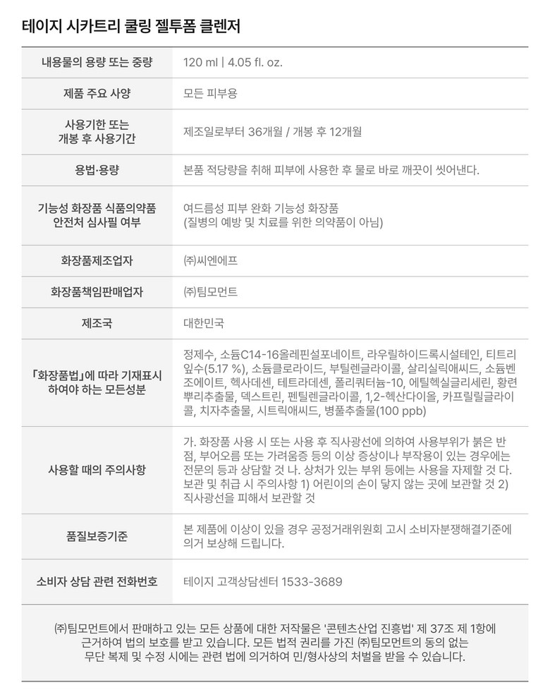 | 화장품제조업자, 화장품책임판매업자 및 맞춤형화장품판매업자 | 상품 상세페이지 참조 | 제조국 | 상품 상세페이지 참조 |