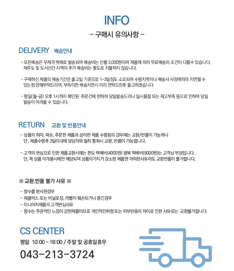 | 배송기간 | ㆍ도서산간 지역 등은 배송에 3-5일이 더 소요될 수 있습니다. - 천재지변, 물량 수급 변동 등 예외적인 사유 발생 시, 다소 지연될 수 있는 점 양해 부탁드립니다. | ||