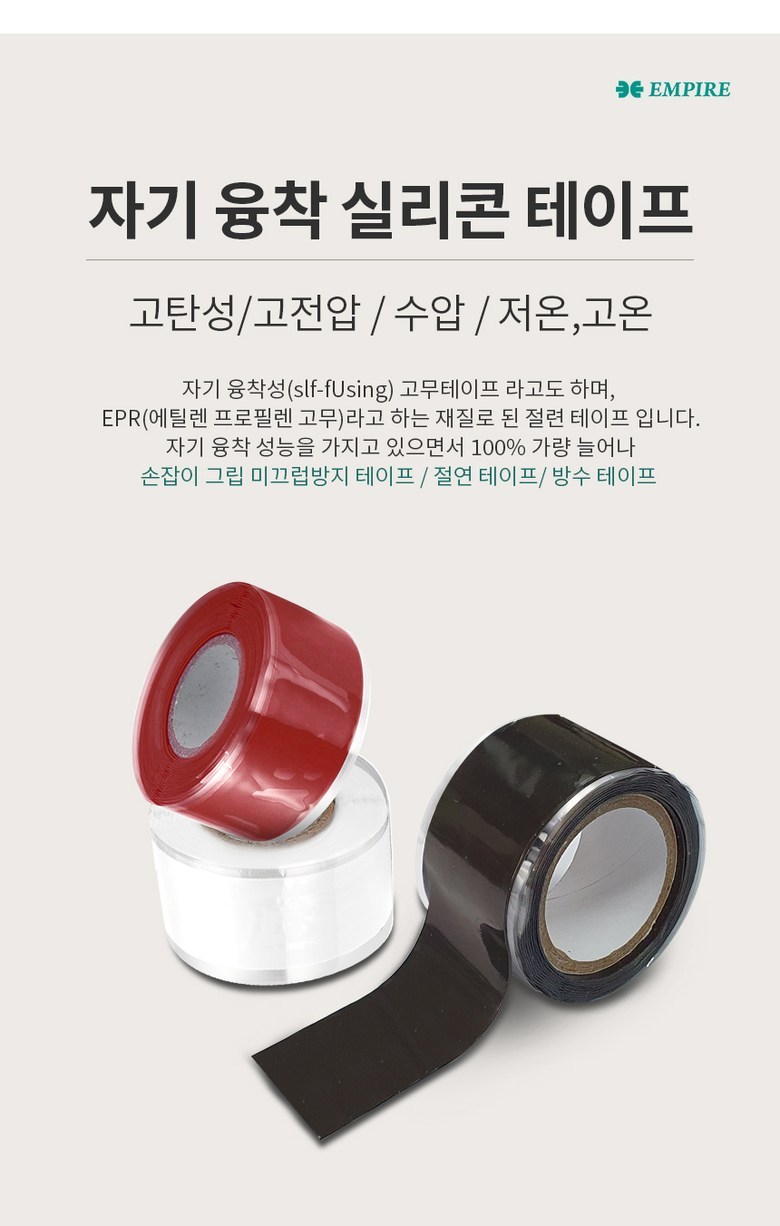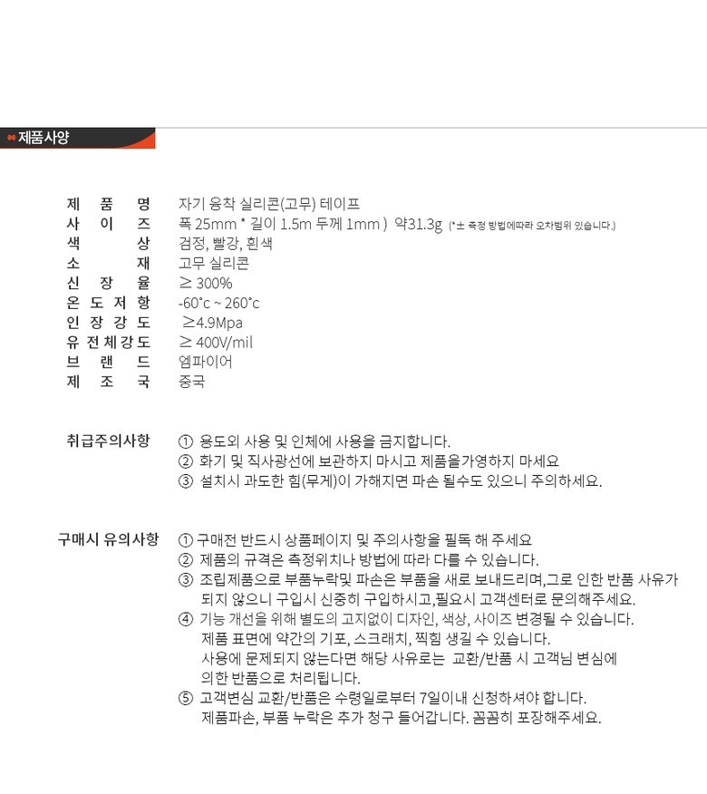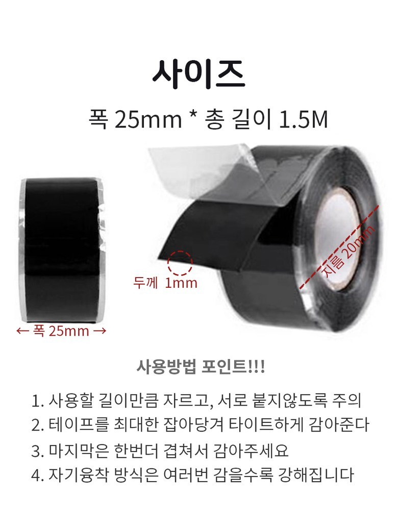 | 품명 및 모델명 | 실리콘 자기 융착 테이프 25mm x 총길이 4.5M | 인증/허가 사항 | 해당없음 |