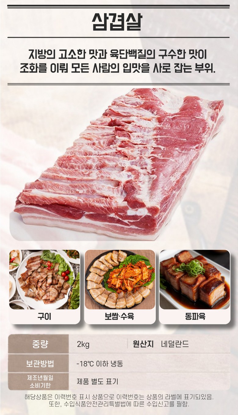| 품목 또는 명칭 | 통삼겹 통삼겹살 캠핑용 바베큐 구이용 보쌈용 2kg | 포장단위별 내용물의 용량(중량),수량,크기 | 2kg |