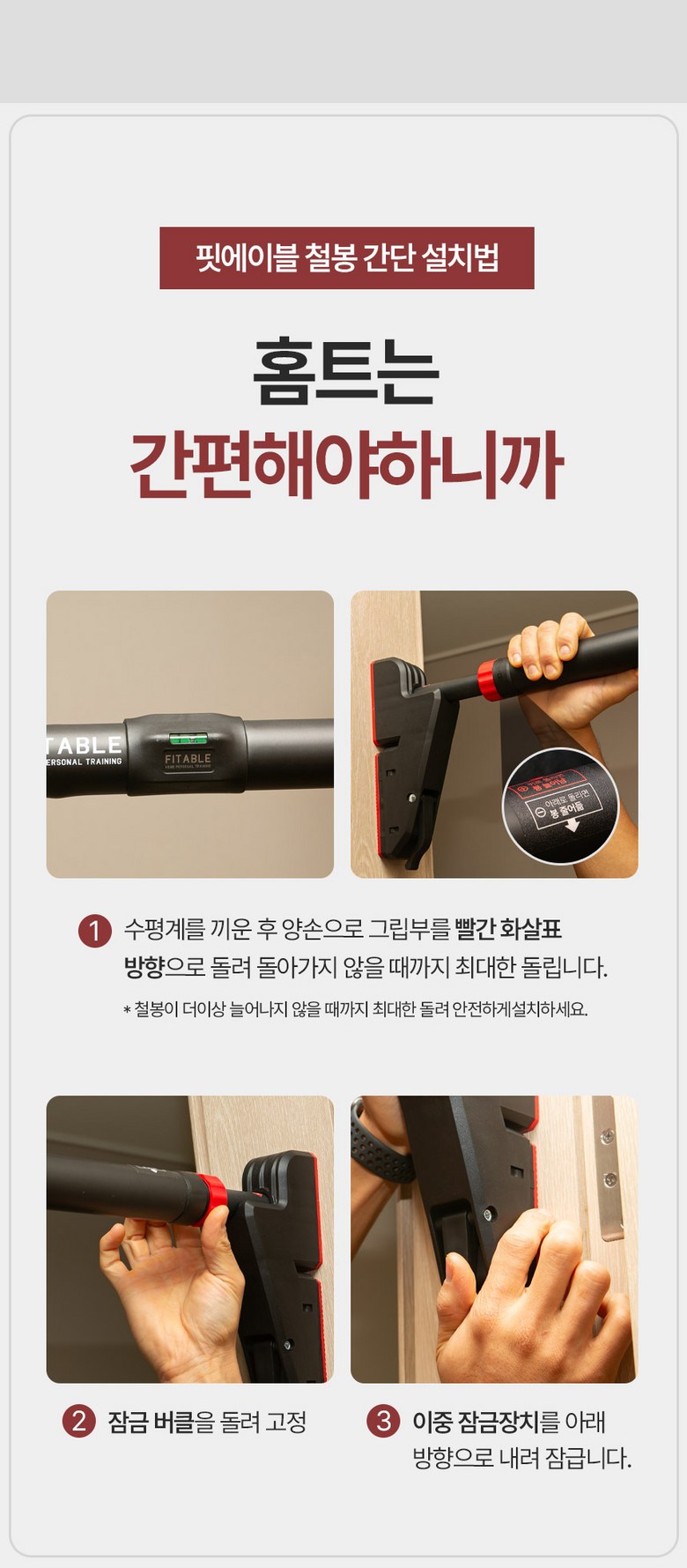 | 재질 | 상품 상세페이지 참조 | 제품 구성 | 문틀 철봉 + 프리미엄 수평계 + 제품설명서 |