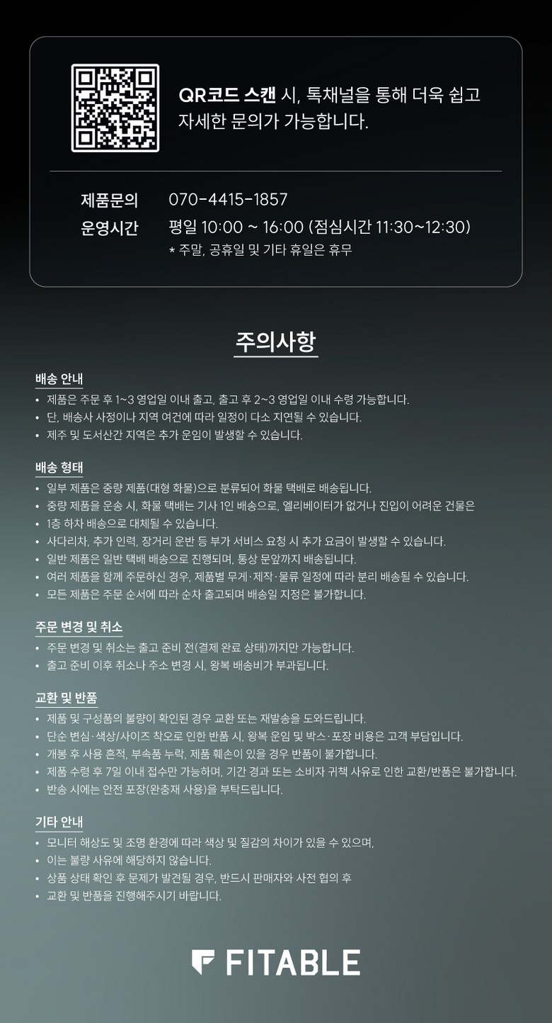 - 상품문의 및 후기게시판을 통해 취소나 환불, 반품 등은 처리되지 않습니다.