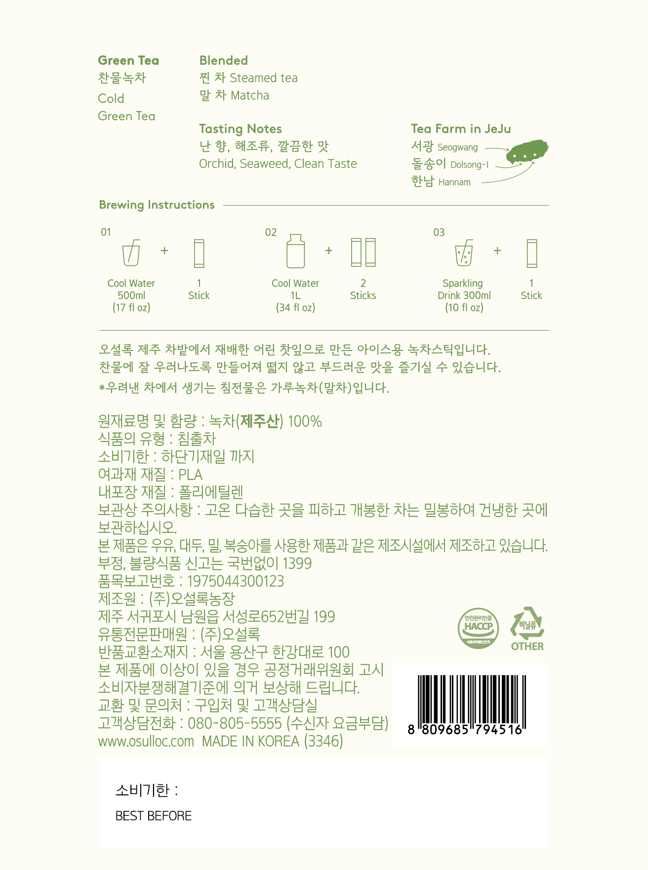 | 제품명 | 오설록 찬물녹차 | 식품의 유형 | 컨텐츠 참조 |