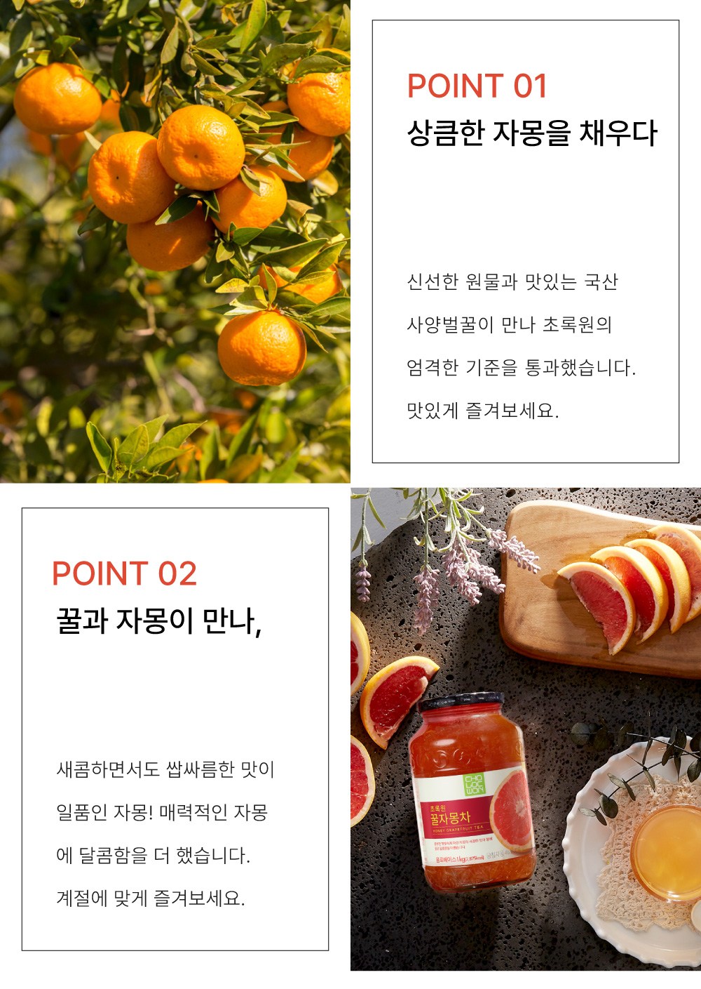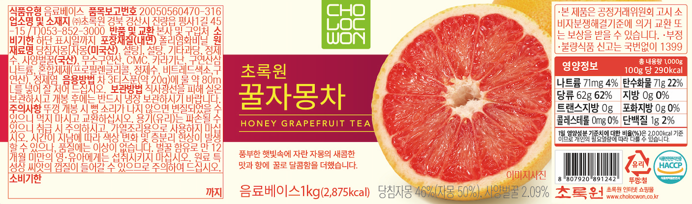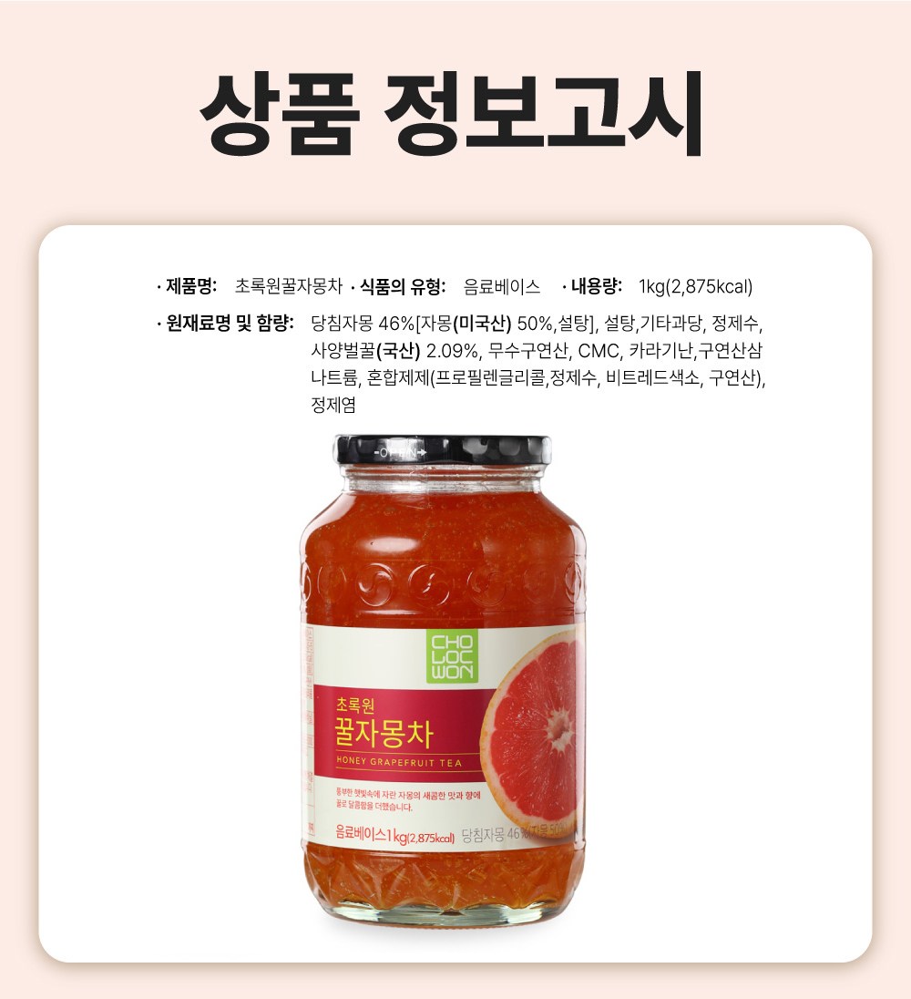 | 제품명 | 초록원꿀자몽차 | 식품의 유형 | 컨텐츠 참조 |