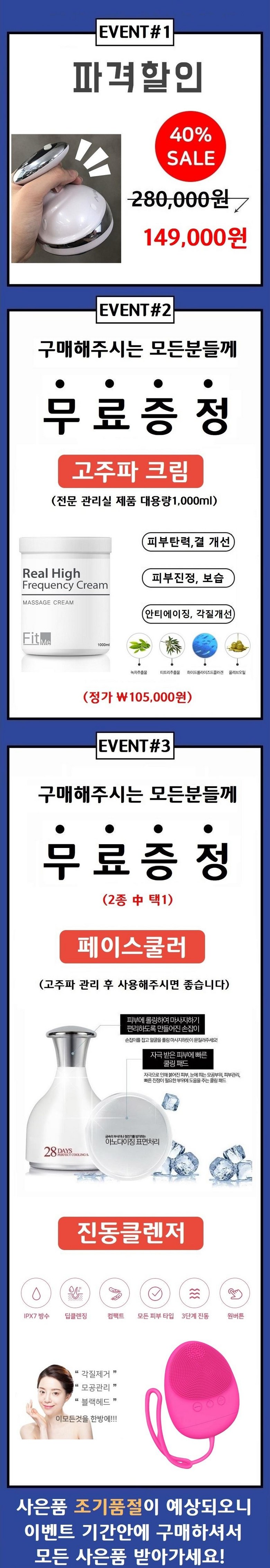 | 제조국(원산지) | 피트미 : 중국 OEM / 고주파크림,쿨링스틱 : 대한민국 / 세안기 : 중국 OEM | 제조자(수입자) | 피트미 : ShenZhen(smc)/고주파크림(가영)/쿨링스틱(메디) /세안기(Tresnds co) |