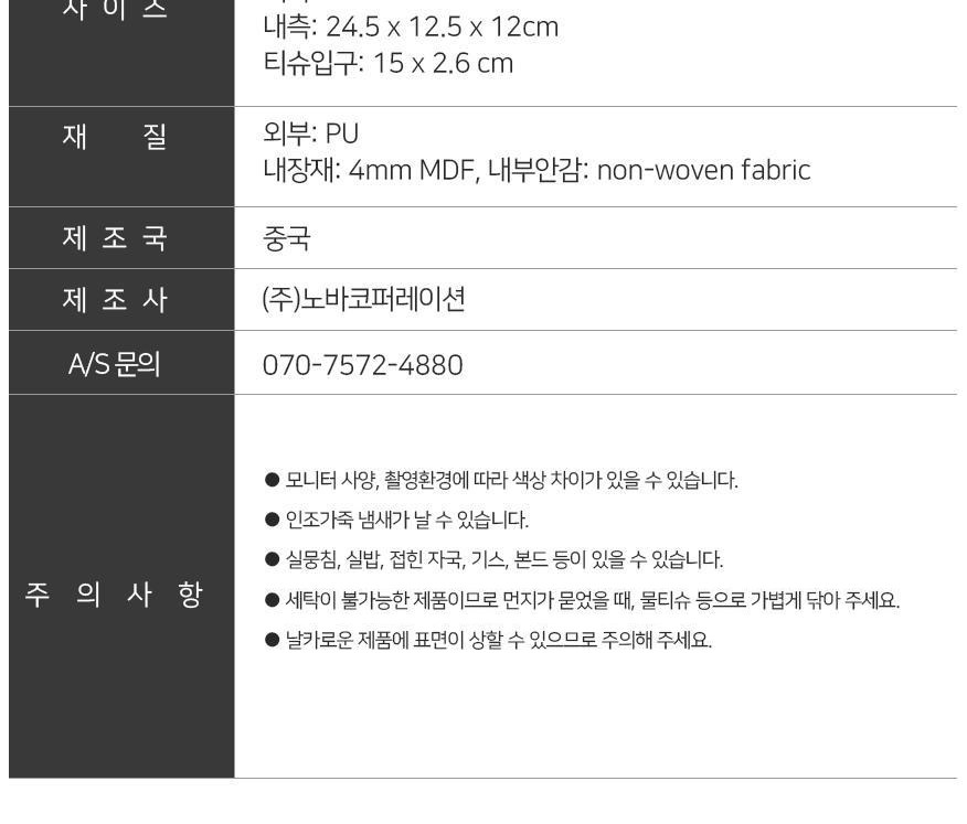| 품명 및 모델명 | 노바리빙 사각 엠보 티슈 케이스 | 인증/허가 사항 | 해당없음 |