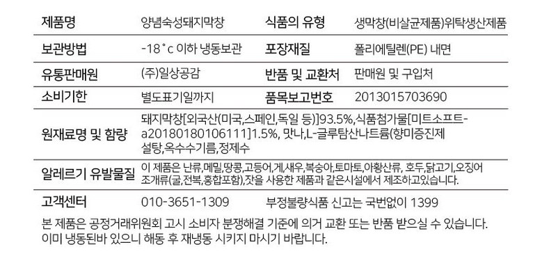 | 품목 또는 명칭 | 숙성 돼지 막창 | 포장단위별 내용물의 용량(중량),수량,크기 | 1kg 1팩 |