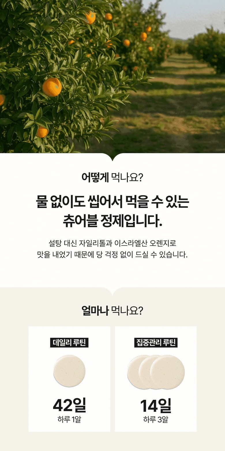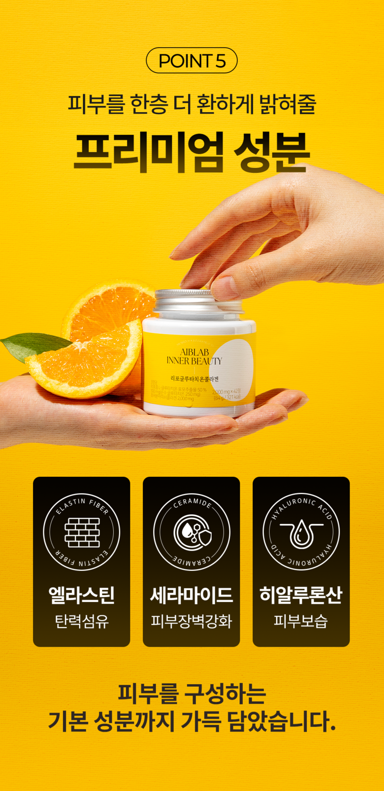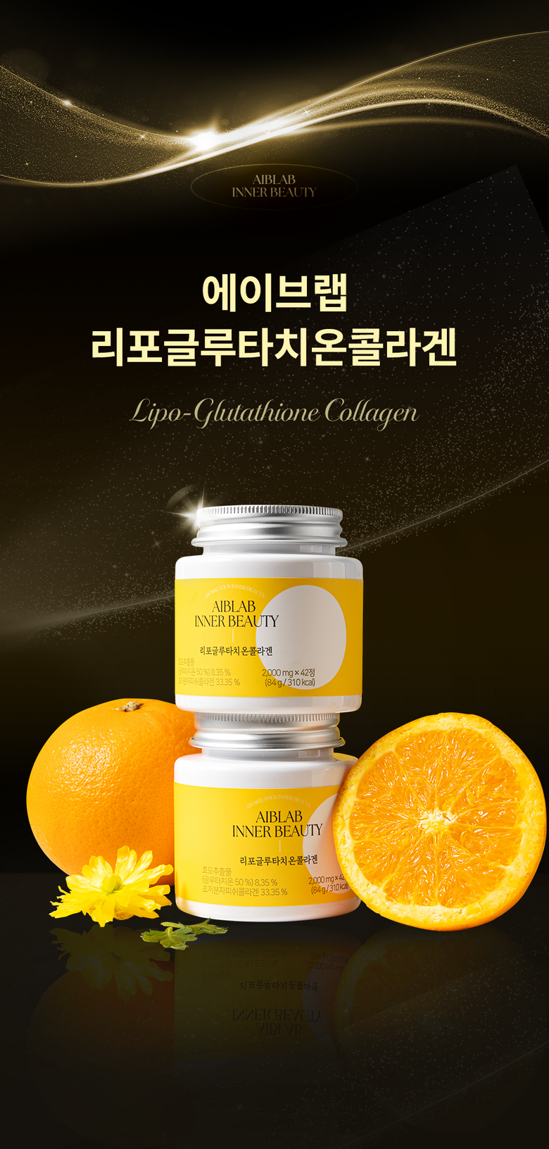 | 포장단위별 내용물의 용량(중량), 수량 | 2000mg x 42정(84g/310kcal) | 원재료명 및 함량 | 초저분자피쉬콜라겐,자일리톨16.539%,오렌지농축분말(덱스트린,오렌지농축액,아라비아검),이소말트10.532%,리포좀L-글루타치온 효모추출물50%(효모추출물,레시틴),오렌지맛분말,비타민C,혼합제제(오렌지주스,덱스트린,유당,오렌지오일,펙틴),스테아린산마그네슘,니코틴산아미드,혼합제제(dl-a-토코페롤,변성전분,포도당시럽분말,이산화규소),혼합제제(말토덱스트린,정제수,구연산삼나트륨,구연산,비타민B12),비타민B6염산염,비타민B2,리포좀비타민C혼합제제(비타민C,말토덱스트린,글리세린,레시틴),엘라스틴가수분해물,화이트토마토농축추출분말,밀크씨슬추출물분말,혼합제제(트레할로스,히알루론산),이산화규소,효소처리스테비아,무수구연산,dl-사과산,우유단백질,선인장열매농축분말,대두,우유,토마토함유 |