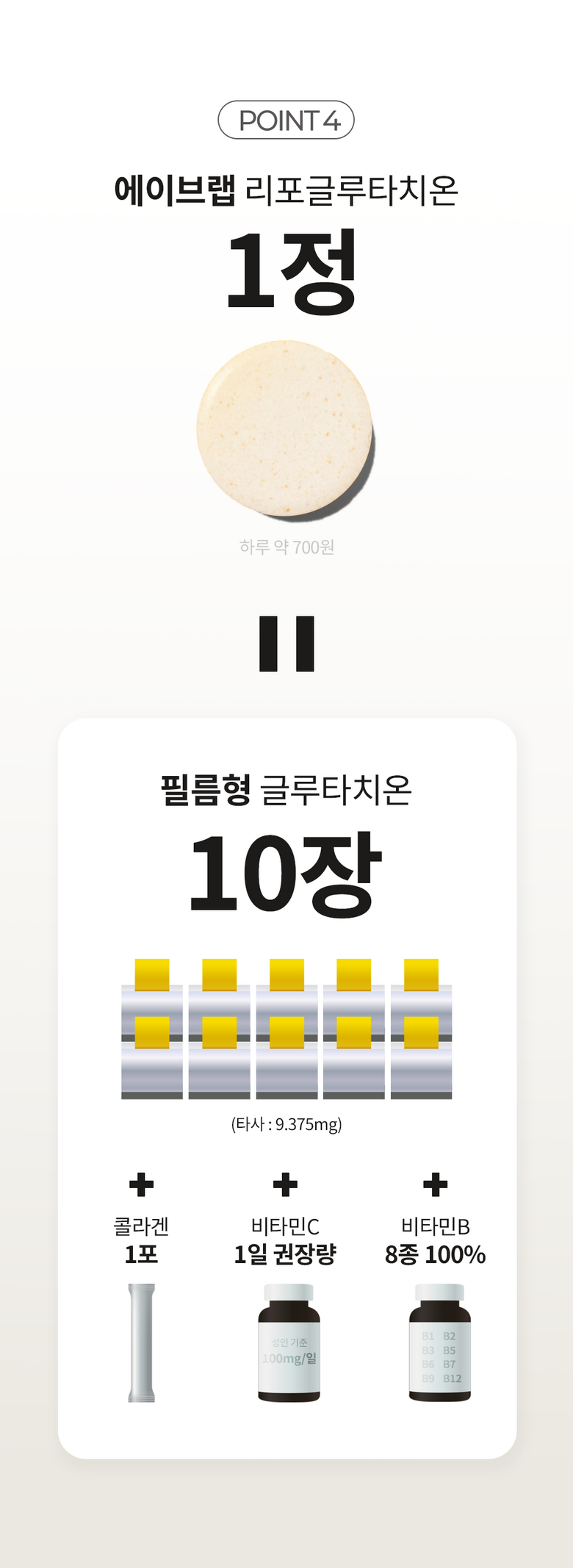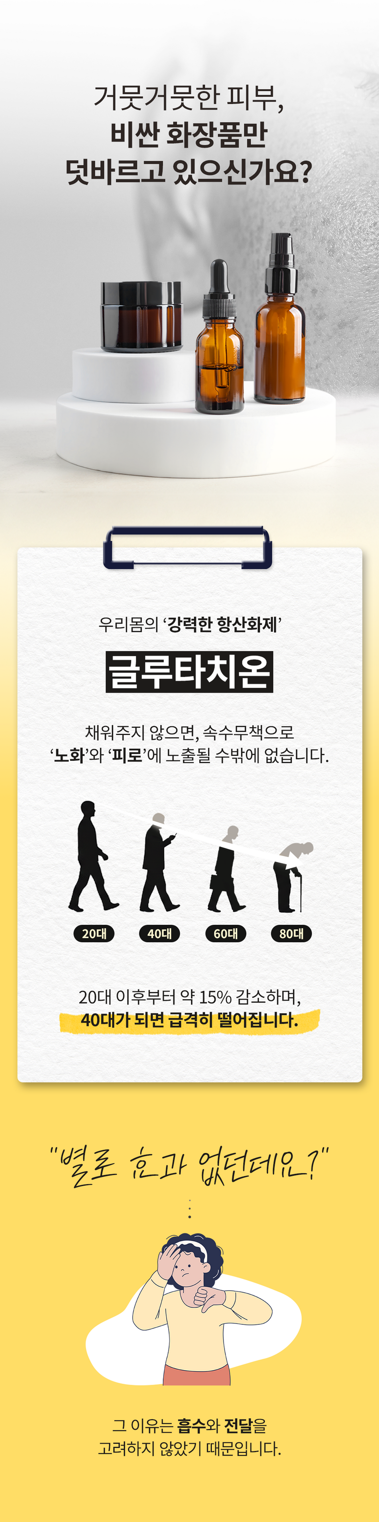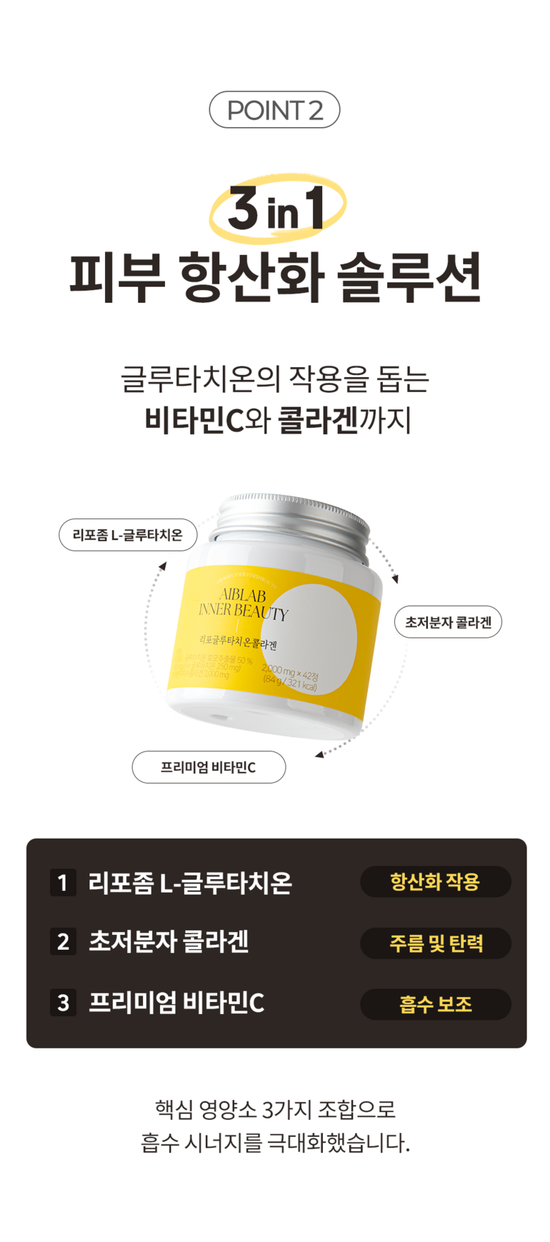 | 포장단위별 내용물의 용량(중량), 수량 | 2000mg x 42정(84g/310kcal) | 원재료명 및 함량 | 초저분자피쉬콜라겐,자일리톨16.539%,오렌지농축분말(덱스트린,오렌지농축액,아라비아검),이소말트10.532%,리포좀L-글루타치온 효모추출물50%(효모추출물,레시틴),오렌지맛분말,비타민C,혼합제제(오렌지주스,덱스트린,유당,오렌지오일,펙틴),스테아린산마그네슘,니코틴산아미드,혼합제제(dl-a-토코페롤,변성전분,포도당시럽분말,이산화규소),혼합제제(말토덱스트린,정제수,구연산삼나트륨,구연산,비타민B12),비타민B6염산염,비타민B2,리포좀비타민C혼합제제(비타민C,말토덱스트린,글리세린,레시틴),엘라스틴가수분해물,화이트토마토농축추출분말,밀크씨슬추출물분말,혼합제제(트레할로스,히알루론산),이산화규소,효소처리스테비아,무수구연산,dl-사과산,우유단백질,선인장열매농축분말,대두,우유,토마토함유 |