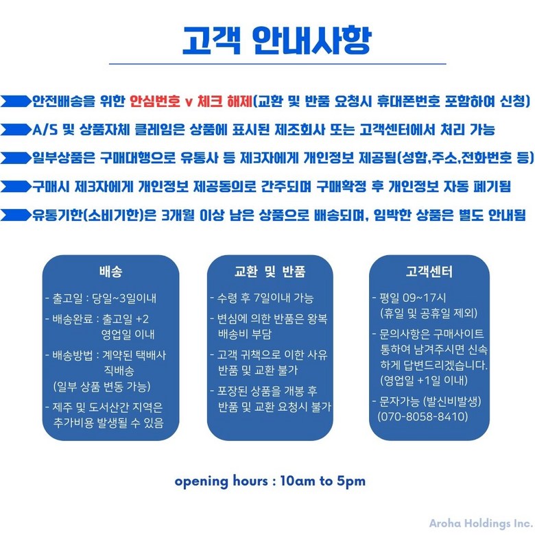 - ㆍ교환/반품에 관한 일반적인 사항은 판매자가 제시사항보다 관계법령이 우선합니다.