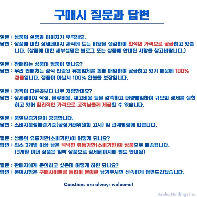 - 가격, 판매자, 교환/환불 및 배송 등 해당 상품 자체와 관련 없는 문의는 고객센터 내 1:1 문의하기를 이용해주세요.
