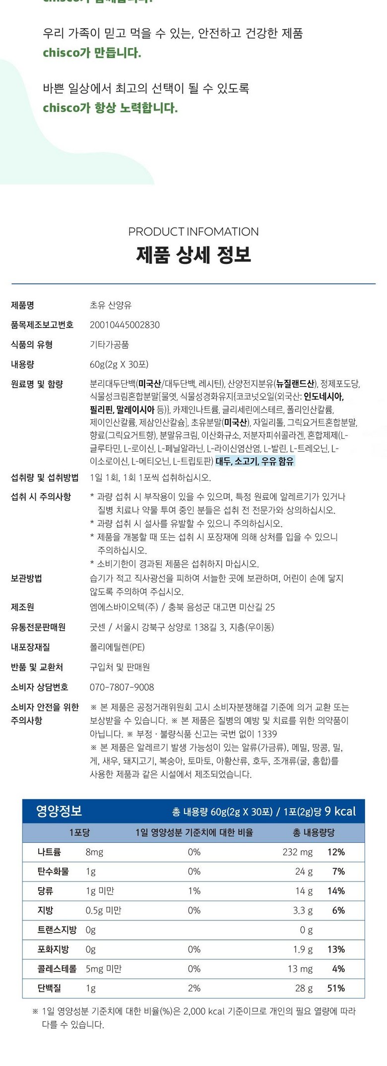 | 원재료명 및 함량 | 산양유 초유 단백분말 | 영양성분 | 상품 상세페이지 참조 |