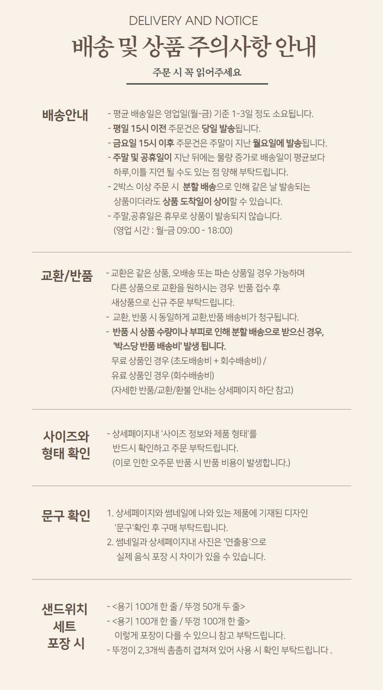 | 배송기간 | ㆍ도서산간 지역 등은 배송에 3-5일이 더 소요될 수 있습니다. - 천재지변, 물량 수급 변동 등 예외적인 사유 발생 시, 다소 지연될 수 있는 점 양해 부탁드립니다. | ||
