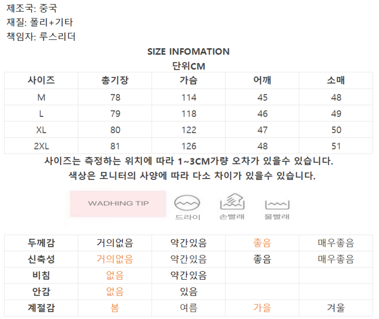 | 제조국 | 중국 | 세탁방법 및 취급시 주의사항 | 상품 상세페이지 참조 |