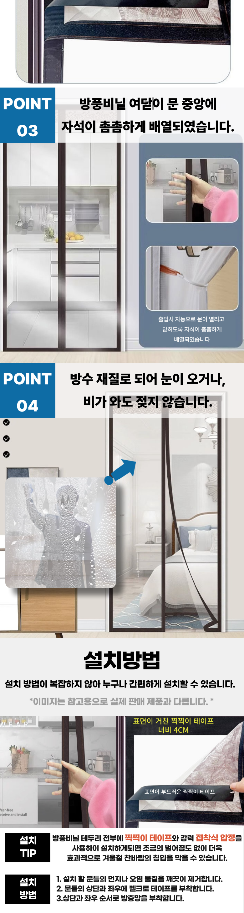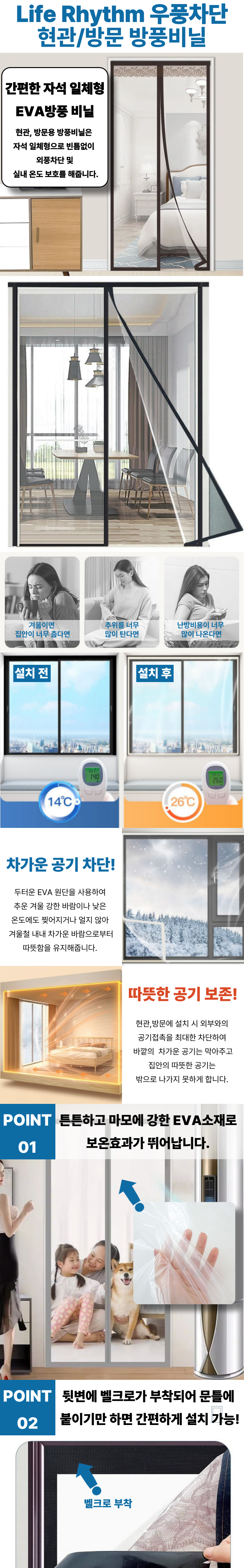 | 품명 및 모델명 | Life Rhythm 외풍차단 EVA 방문 현관문 방풍비닐 투명 문풍지 벨크로 포함 | 인증/허가 사항 | 없음 |